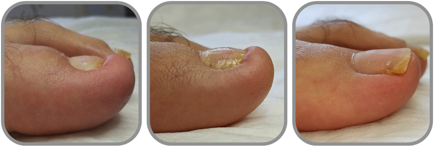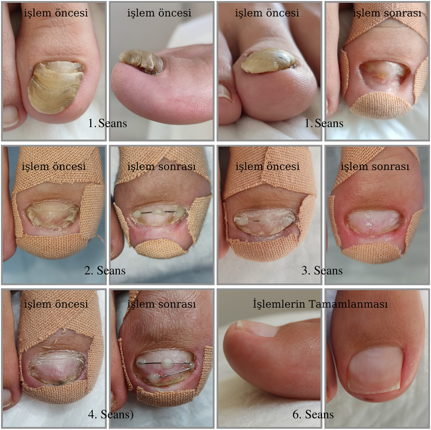 Şekil 6. Distal tırnak batması ve Orthonyxie işlemleri eşliğinde hiponişyumun hipertrofisi (hiponişyumda hipertrofi) olgusunda takip görselleri (Kaynak: Zeliha Gökkaya-Engin Gökkaya Özel Sağlık Meslek Hizmet Birimi arşivindendir. Hastadan görsel onam alınmıştır.)